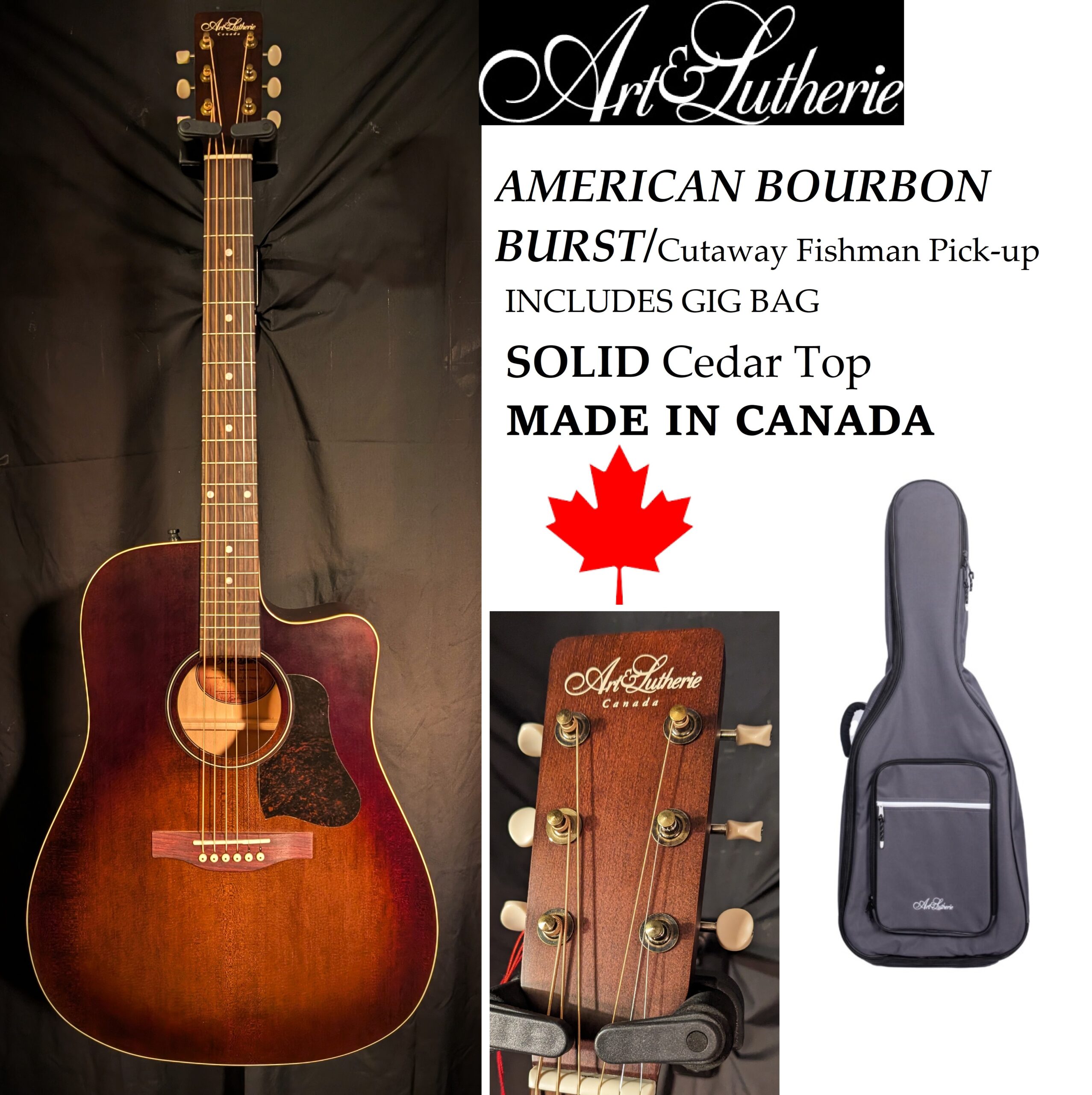 Art Lutherie Americana Dreadnought Cutaway.Solid Cedar top,Wild Canadain Cherry Back&Sides,Cutaway body,Rosewood Fretboard and bridge.Presys II Fishman pick-up system with Tuner.NO CHARGE Gig Bag $109 Value